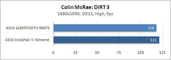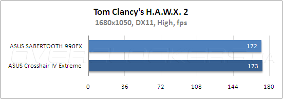 В шутере от первого лица FarCry 2 первенство держит системная плата Sabertooth 990FX, в то время как в двух остальных играх — Colin McRae: DiRT 3 и Tom Clancy's H.A.W.X. 2 — можно наблюдать небольшое преимущество Crosshair IV Extreme.