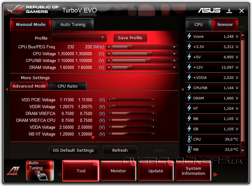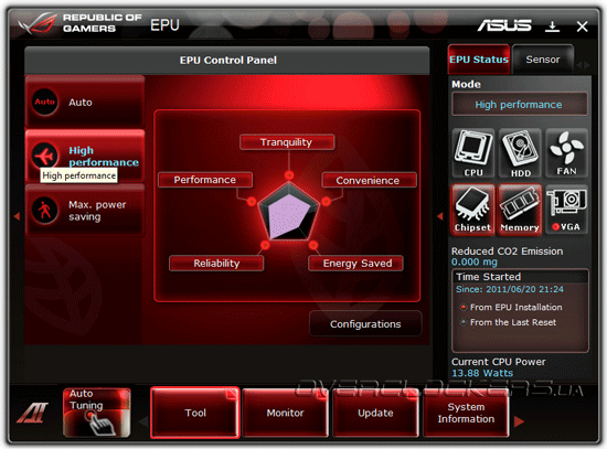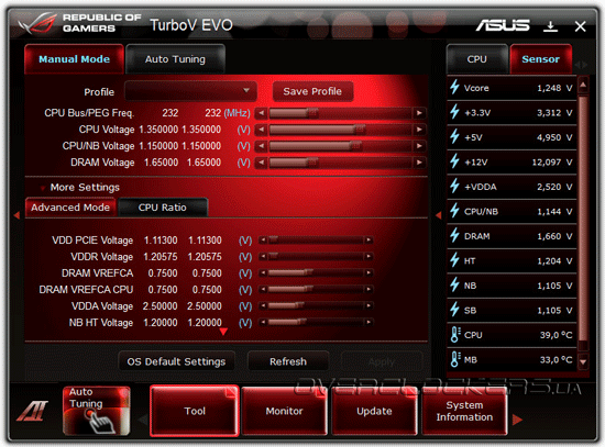 Материнская плата ASUS Crosshair V Formula, как и все другие продукты серии Reapublic Of Gamers, комплектуется качественным и функциональным программным обеспечением ASUS AI Suite II и ROG Connect. Последний был подробно рассмотрен во время обзора системной платы ASUS Crosshair IV Extreme. Интерфейс программы RC Connect, которая устанавливается на ноутбук, ничуть не изменился, нет отличия и в функциональности. А вот новая подсистема питания центрального процессора Extreme Engine DIGI+ добавила некоторые новые возможности к программному пакету ASUS AI Suite II. Утилита TurboV EVO по-прежнему позволяет управлять частотой HTT, множителями вычислительных ядер процессора и основными напряжениями, а также осуществлять аппаратный мониторинг. Очень жаль, что программа не позволяет управлять задержками и частотой оперативной памяти.