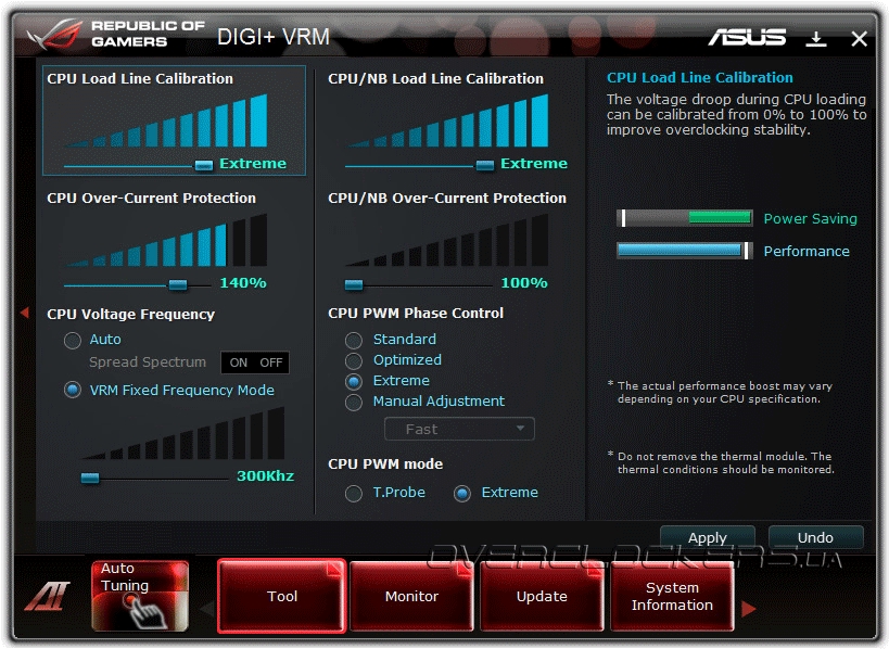 Программа DIGI+ VRM уже встречалась нам во время знакомства с системной платой ASUS P8P67 Deluxe. По большому счету, этот модуль дублирует функциональность подраздела прошивки Digi+ VRM/POWER и позволяет управлять параметрами Load Line Calibration, Voltage Over-Current Protection, CPU PWM Phase Control и частотой переключения VRM центрального процессора в режиме реального времени.