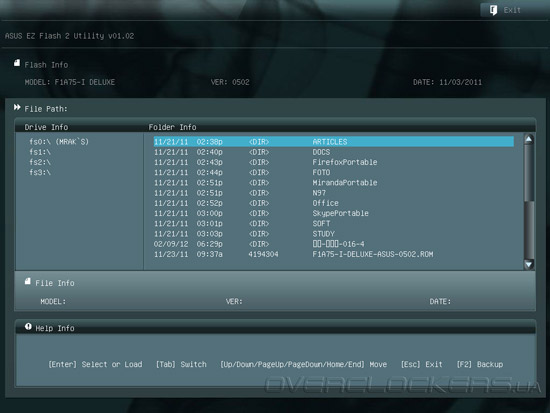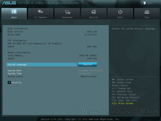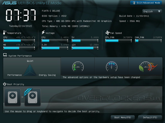 Как и большинство современных системных плат ASUS F1A75-I Deluxe в качестве прошивки использует UEFI — Unified Extensible Firmware Interface, который, в сравнении с традиционным BIOS, предлагает куда большие возможности расширения. Материнские платы ASUS в своих UEFI Setup используют микрокод AMI, графический интерфейс которого значительно переработан, а функциональность существенно расширена благодаря ряду фирменных особенностей. Одна из них — режим EZ-Mode, в котором отображается текущие дата и время, характеристики основных компонентов системы и показания датчиков аппаратного мониторинга. Здесь же можно выбрать загрузочный накопитель и задать предустановленный профиль быстродействия. Доступно изменение языка отображения меню, но русского в списке поддерживаемых, увы, нет.
