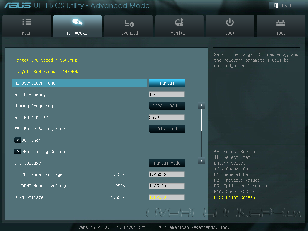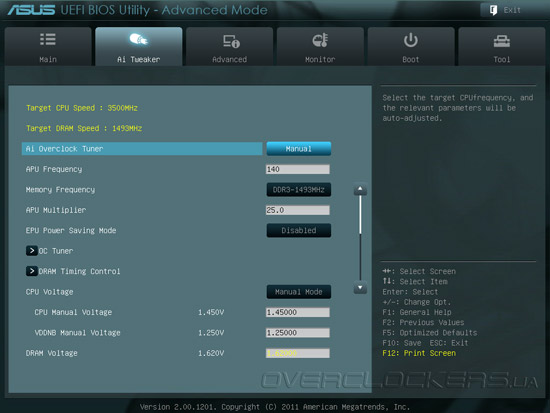 Для достижения 3500 МГц нам пришлось увеличить напряжение на вычислительных ядрах до 1,45 В, а встроенный северный мост работал при 1,25 В. Благодаря работе функции Load Line Calibration питание процессора оставалось стабильным даже под нагрузкой. Кроме того, множитель APU был вручную уменьшен до 25, а модули ОЗУ работали на частоте 1494 МГц с задержками 9-9-9-24-1Т. Следствием этого стало отключение функций энергосбережения, частота и напряжение на процессоре не понижались даже в моменты простоя. Мы сознательно выбрали такой режим, стараясь удержать значение базовой частоты на 140 МГц, чтобы обеспечить максимальный разгон встроенного графического ядра.