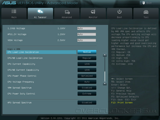 Все настройки, связанные с разгоном и управлением быстродействием содержатся в меню AI Tweaker. Именно здесь можно установить тактовую частоту опорного генератора, задать коэффициенты умножения для вычислительных ядер и модулей ОЗУ. Опция OC Tuner активирует функцию автоматического разгона, работу которой мы обязательно проверим, а включение режима EPU Power Saving mode задействует дополнительные механизмы энергосбережения. Значительная часть меню занята управлением подсистемой питания DIGI+ VRM.