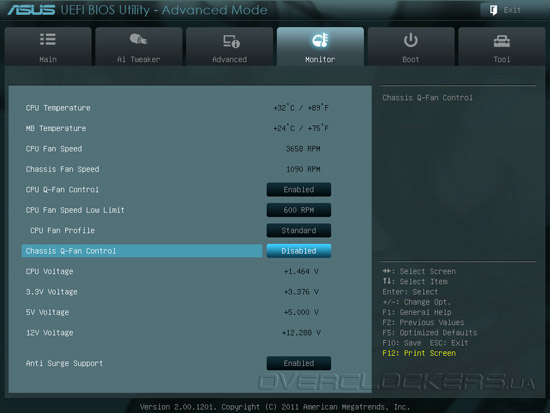 Раздел системного мониторинга Monitor содержит все необходимое для контроля состояния системы. Отображаются значения двух температур и четырех основных напряжений — на вычислительных ядрах и шинах +3,3 В, +5 В и +12 В. Для обоих вентиляторов контролируются текущие скорости вращение, также можно выбрать один из предустановленных режимов работы или задать профиль управления оборотами в зависимости от температуры.