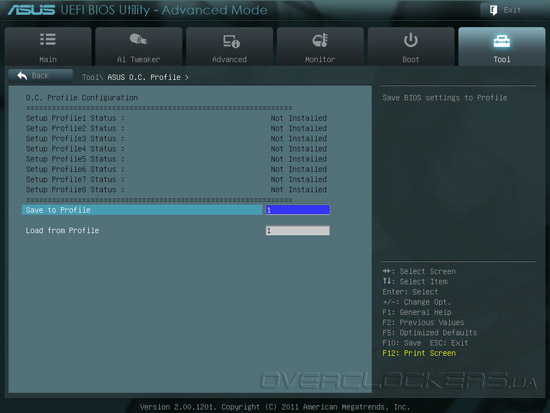 Как и полагается современной плате, подменю ASUS O.C. Profile позволяет сохранить до восьми профилей настроек, а встроенная утилита ASUS EZ Flash Utility предназначена для резервного копирования и обновление микрокода UEFI.
