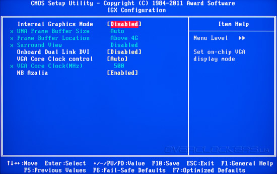 Настройки интегрированного в APU графического акселератора находятся в подменю IGX Configuration. Кроме регулировки размера кадрового буфера, пользователь может управлять режимом Surround View, а также задавать тактовую частоту встроенного видеоускорителя. Заметим, что последняя возможность доступна только владельцам AMD A-series с литерой «К» в названии модели.