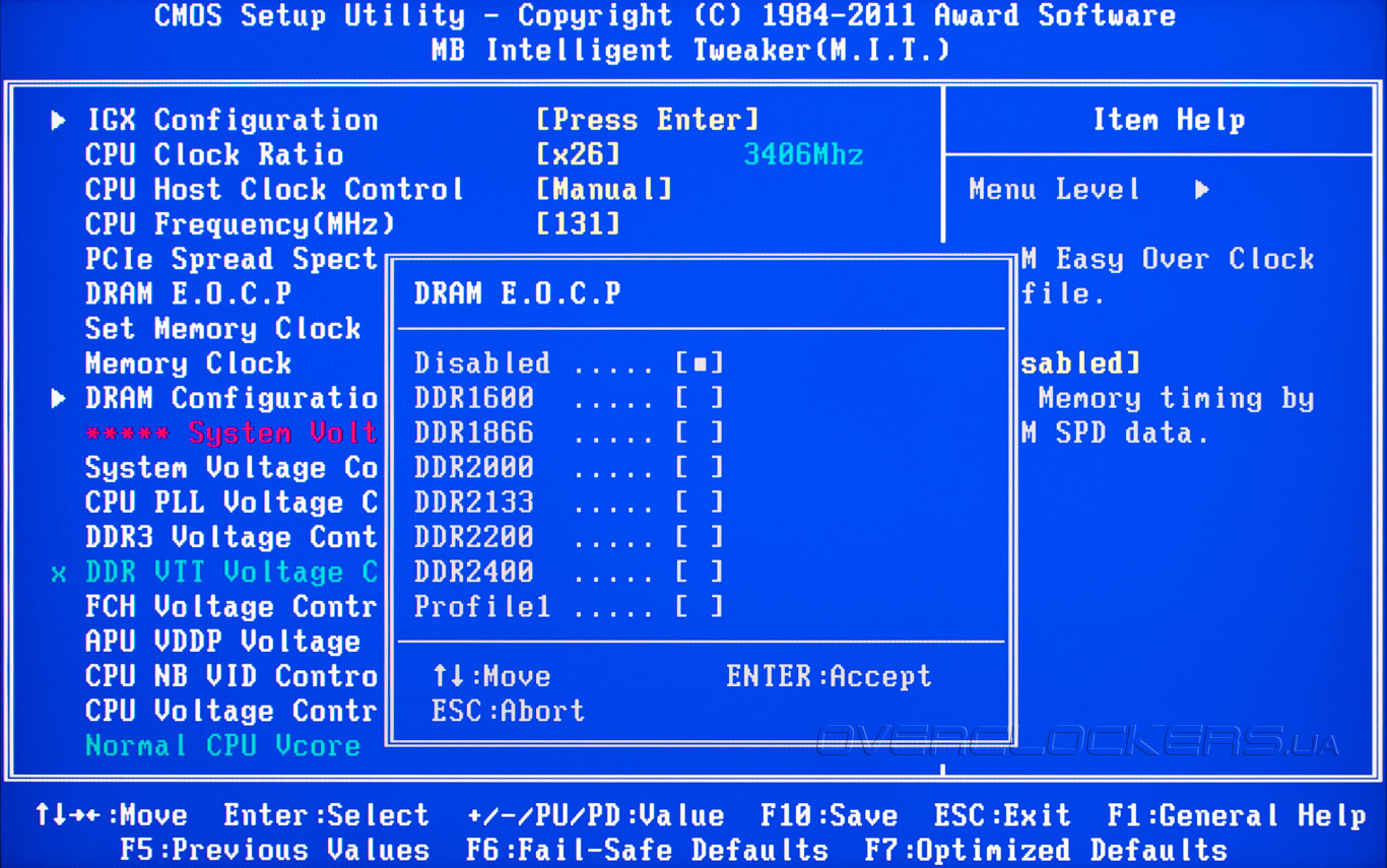 Меню настройки системной платы обладает расширенными возможностями по настройке режима работы оперативной памяти. Благодаря функции DRAM E.O.C.P. пользователю достаточно выбрать желаемую частоту модулей ОЗУ, после чего прошивка самостоятельно подберет соответствующий множитель и значение HTT, а также установит необходимые задержки.