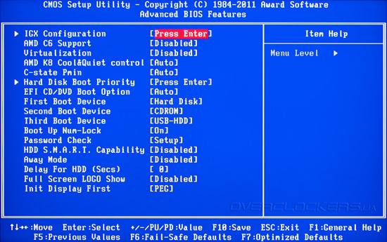 Опции, отвечающие за процесс загрузки, сосредоточены в меню Advanced BIOS Features. Кроме выбора загрузочных устройств и порядка инициализации видеокарт в этом же разделе находятся органы управления аппаратной виртуализацией, а также функциями энергосбережения гибридного процессора.