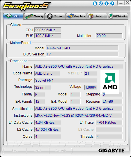 Фирменная утилита EasyTune6 предназначена для отображения подробной системной информации, настройки параметров быстродействия, управления скоростью вращения процессорного вентилятора и вывода показаний аппаратного мониторинга. В главном окне пользователь может почерпнуть достоверные данные об установленных в системе APU и модулях оперативной памяти.