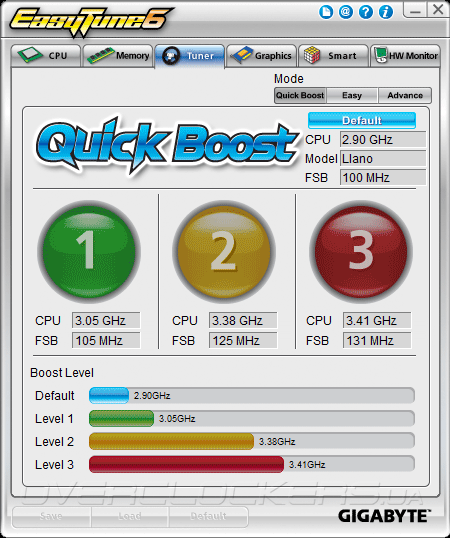 EasyTune6 предлагает возможность автоматического разгона, для этих целей программа имеет несколько предустановленных профилей быстродействия. Опытные пользователи могут воспользоваться режимом ручных настроек, в котором доступно управление частотой HTT, коэффициентами умножения вычислительных ядер и модулей ОЗУ, а также напряжением на гибридном процессоре. Отметим возможность регулировки тактовых частот для дискретной видеокарты.