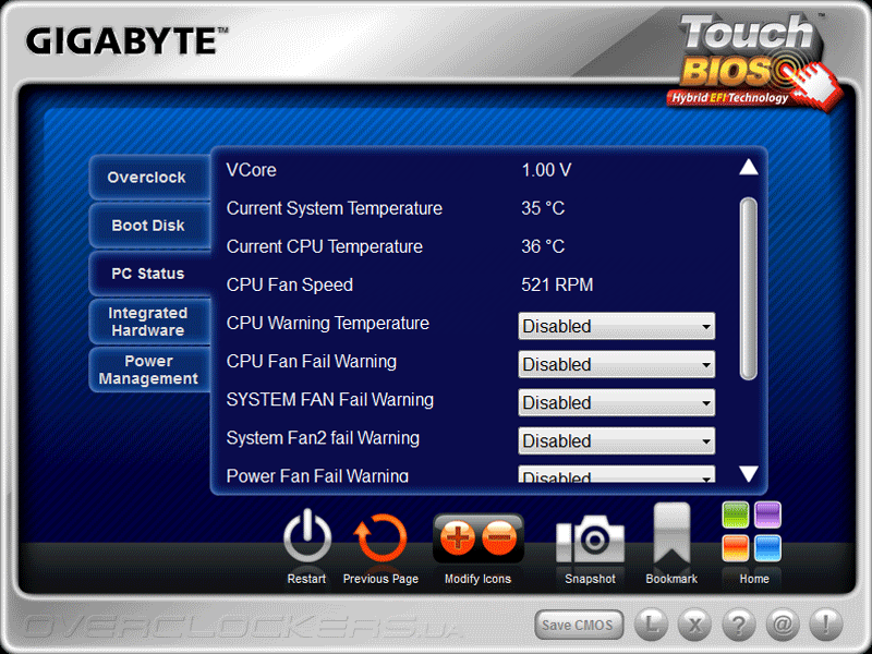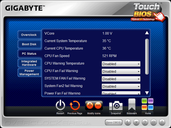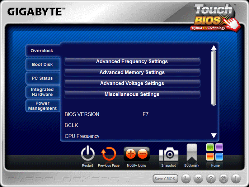 В принципе, EasyTune6 отлично справляется со своими обязанностями, что делает её очень удобной во время экспериментов по разгону. Можно лишь посетовать на невозможность управления задержками модулей ОЗУ и скудный набор регулируемых напряжений. Зато следующая программа — Touch BIOS — дает полный контроль над всеми настройками материнской платы и отчасти компенсирует отсутствие графического интерфейса в прошивке. Уникальная особенность данной утилиты состоит в том, что изменении вносятся на уровне управляющего микрокода, правда, для применения новых параметров требуется перезапуск операционной системы.