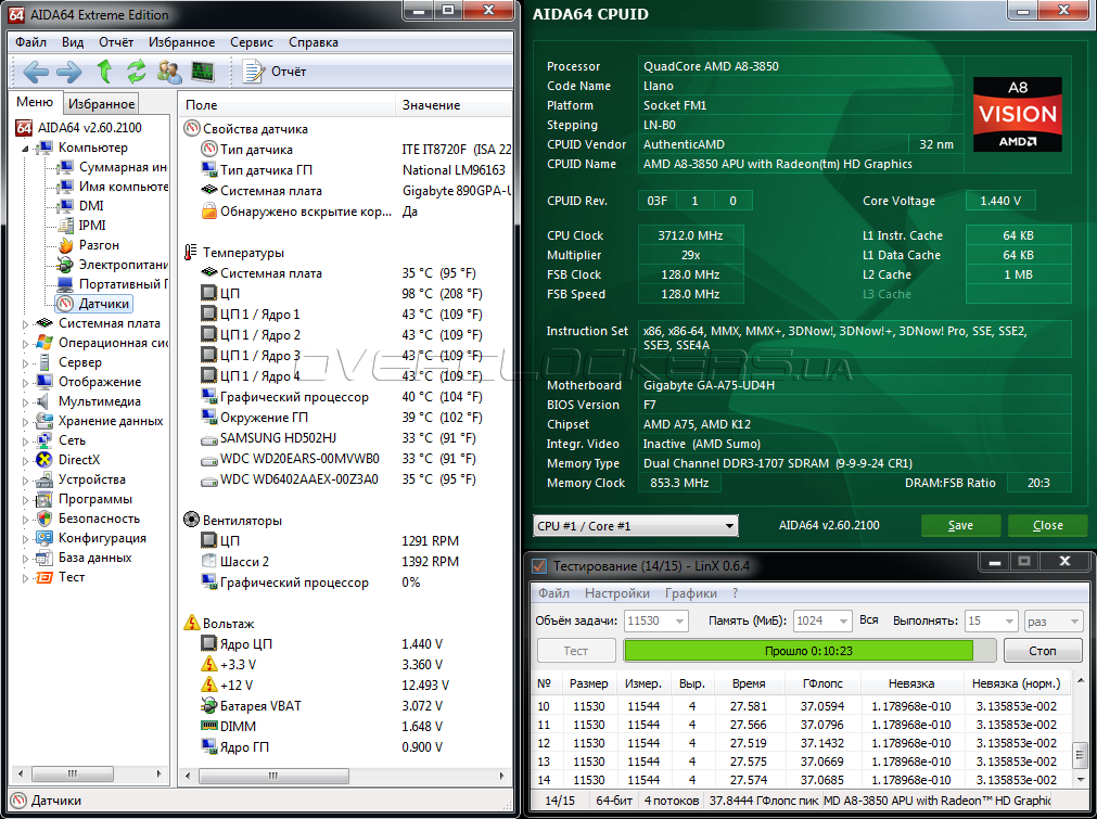 В итоге, гибридный процессор без труда проходил тестирование в LinX на частоте 3720 МГц, а напряжение, несмотря на отсутствие в пошивке функции Load-Line Control, стабильно держалось на уровне 1,44 В. Надо ли говорить, что воздушный кулер Zalman CNPS10X Flex без труда справился с возросшим тепловыделением? К положительным моментам следует отнести сохранение работоспособности технологии C’n’Q, которая снижала частоту и напряжение APU в моменты минимальной загрузки.