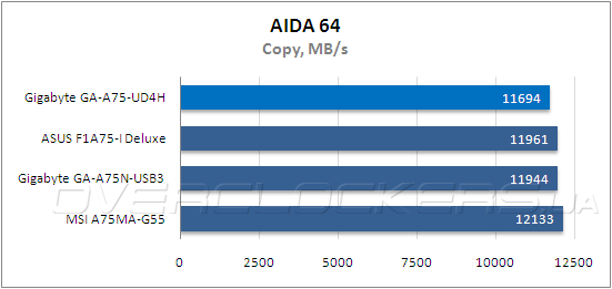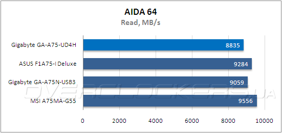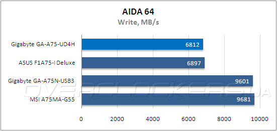 Как и в предыдущем случае Gigabyte GA-A75-UD4H показала лучший балл, так что нам остается списать провальное выступление в AIDA64 Cache & Memory benchmark на «глюки» прошивки.