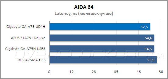 Результаты, которые показывает новинка в этом синтетическом бенчмарке, мягко говоря, озадачивают. Если корректность измерения в тесте записи вызывает определенные подозрения, то отставание Gigabyte GA-A75-UD4H от соперниц в операциях чтения и копирования нас насторожила. Зато латентность доступа к оперативной памяти у новинки оказалась наименьшей среди квартета участниц. Остается надеяться, что низкие результаты в синтетическом приложении не повлияют на быстродействие в реальных приложениях.