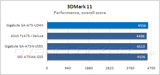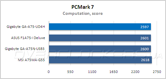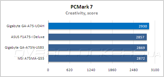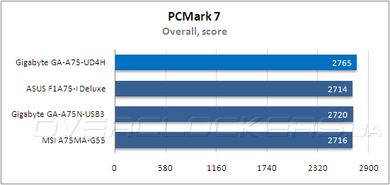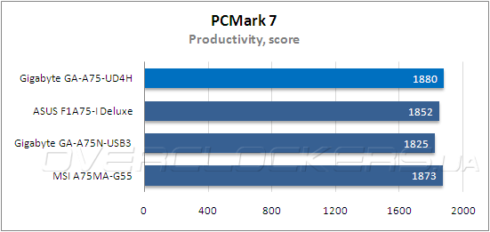 Во всех без исключениях тестовых сценариях новинка заняла первые места, что и обеспечило ей победу в Futuremark PCMark 7. Этот факт означает, что в повседневных задачах производительность GA-A75-UD4H находится на уровне лучших системных плат для APU A-series.