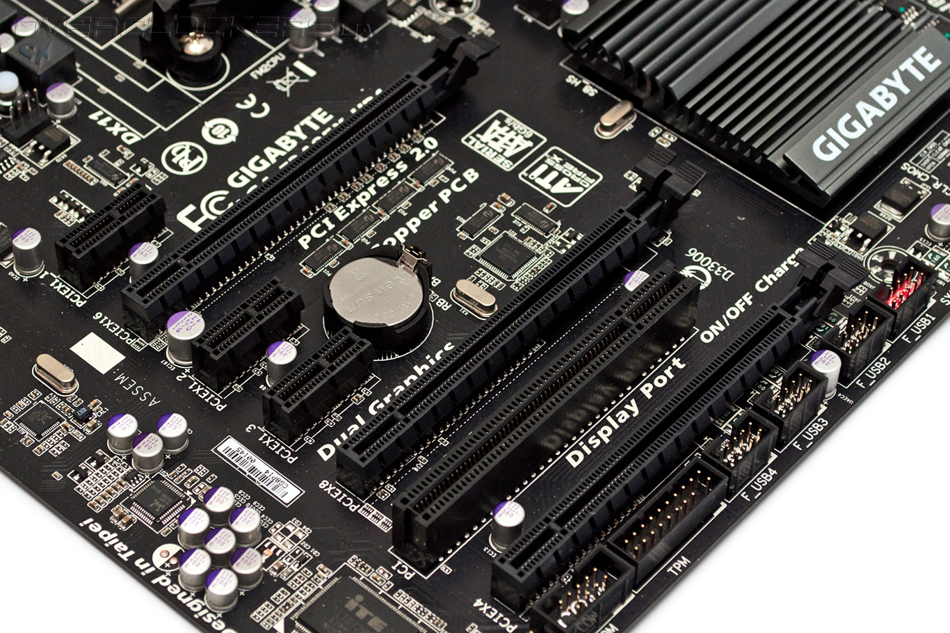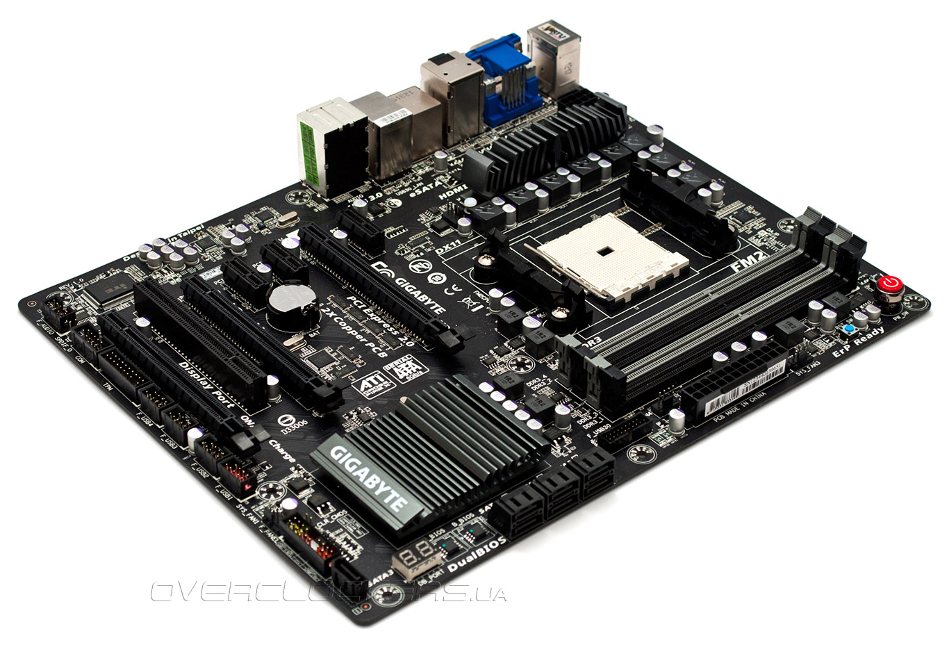 В основе материнской платы лежит чипсет AMD A85X, который обеспечивает совместимость с APU A-Series второго поколения и процессорами Athlon в исполнении Socket FM2, имеющими TDP до 100 Вт включительно. Для установки ОЗУ предназначены четыре слота DIMM DDR3, которые могут принять модули суммарным объемом 64 ГБ. В штатном режиме доступны частоты до 1866 МГц, а в разгоне — до 2400 МГц, поддерживается двухканальный доступ к ОЗУ. Системная плата Gigabyte предлагает богатые возможности по работе со встроенным видеоядром. Для вывода изображения GA-F2A85X-UP4 имеет полный набор видеовыходов: аналоговый D-Sub, а также цифровые DVI-D, DisplaPort и HDMI. Из-за конструктивных ограничений интегрированной видеокарты одновременно можно задействовать только три из них, зато, благодаря поддержке технологии AMD Eyefinity пользователи могут «растянуть» рабочий стол сразу на три монитора. Функция AMD Dual Graphics позволяет объединять ресурсы встроенной и дискретной видеокарт, а владельцы нескольких идентичных графических акселераторов имеют возможность организовать конфигурацию AMD CrossFireX. Для этих целей новинка предлагает три разъема PCI Express 2.0 x16. Функционирование двух слотов обеспечивает гибридный процессор: 16 доступных линий PCI Express 2.0 могут монопольно отдаваться первому разъему или разделяться поровну между двумя слотами PCI-E 2.0 x16. Третий разъем всегда работает в режиме PCI Express 2.0 x16@x4, а за его работу отвечает системная логика.
