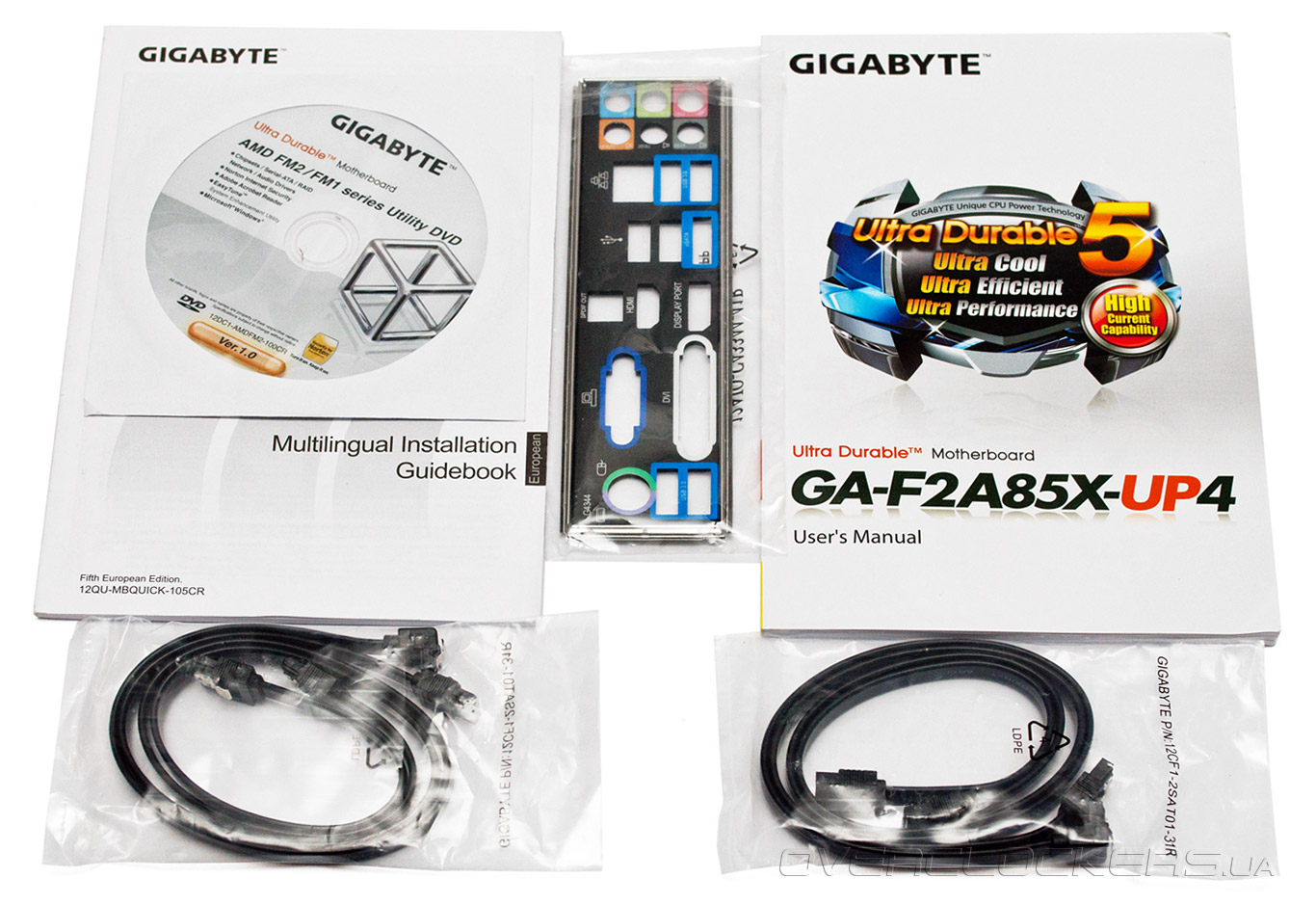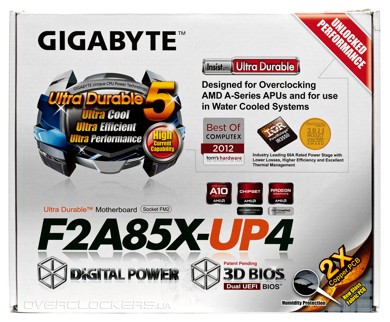 Коробку материнской платы GA-F2A85X-UP4 сложно перепутать с продукцией других вендоров, так как Gigabyte с годами выработала скромный, но узнаваемый фирменный дизайн упаковки. Центральное место в оформлении занимает логотип Ultra Durable 5, который означает применение в цепях преобразователя напряжения интегральных микросхем, содержащих драйвер и пару силовых транзисторов. По заявлению производителя, такая конструкция позволяет увеличить эффективность узла VRM, а также снизить его нагрев и улучшить разгонный потенциал процессора.