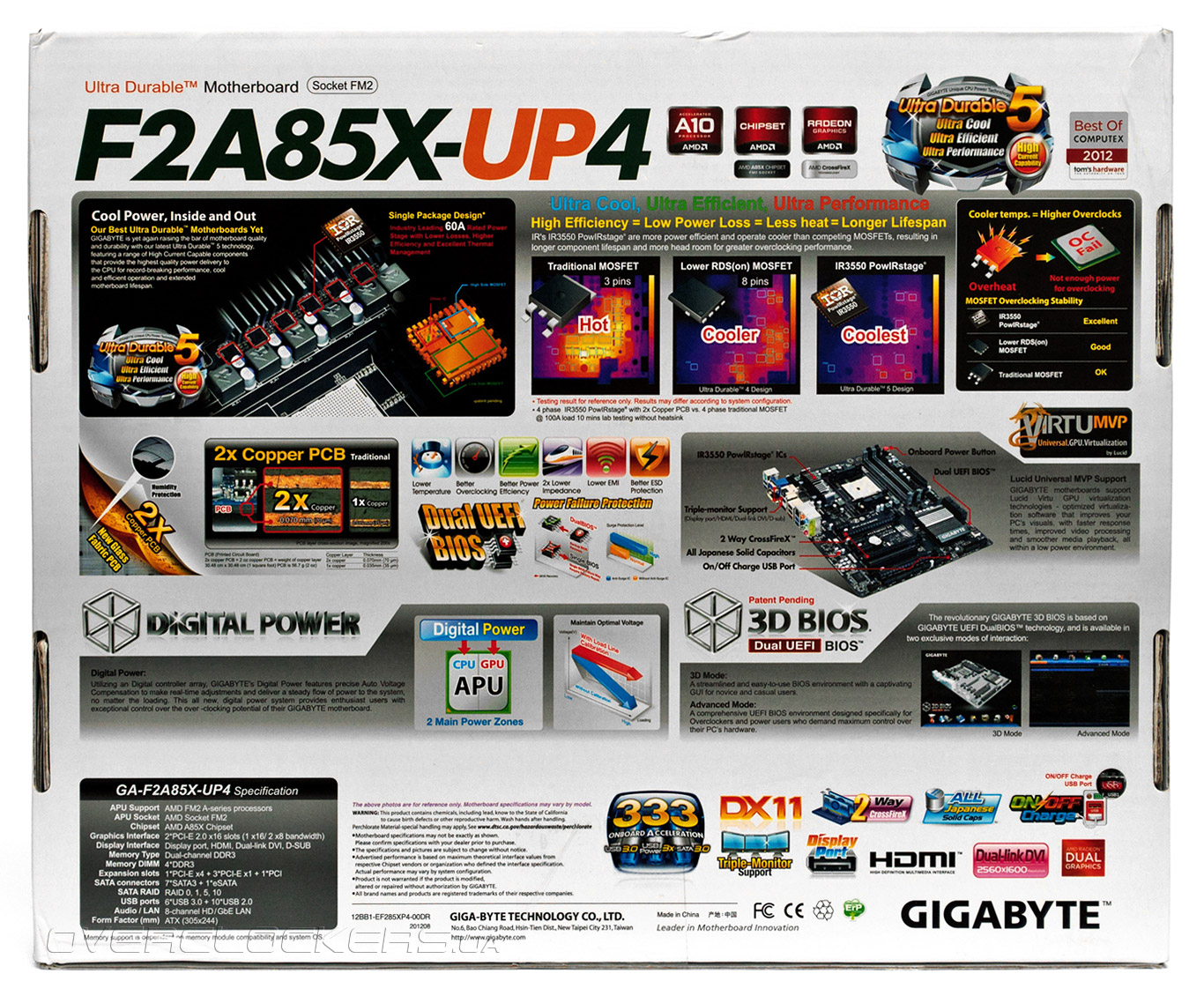 С обратной стороны можно увидеть краткую спецификацию и схематическое изображение системой платы с указанием её ключевых особенностей. Здесь же можно узнать подробности о фирменных технологиях Digital Power и 3D BIOS. Первая означает использование цифрового управления преобразователя напряжения гибридного процессора, а вторая — использование в качестве микрокода Unified EFI с оригинальным графическим интерфейсом. Также, можно узнать о наличии у GA-F2A85X-UP4 двух микросхем с пошивкой: основной и резервной, а также поддержке продуктом Gigabyte технологии виртуализации Lucid Virtu MVP.