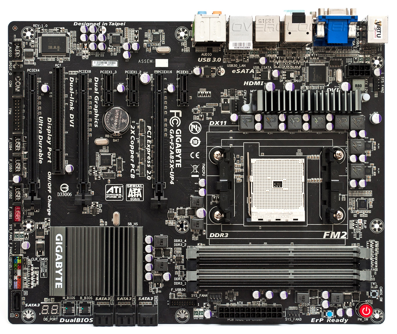 Материнская плата GigabyteGA-F2A85X-UP4 выполнена в формате ATX, размеры PCB составляют 305х244 мм. Благодаря достаточной площади текстолита инженерам удалось разместить все основные узлы на привычных местах.