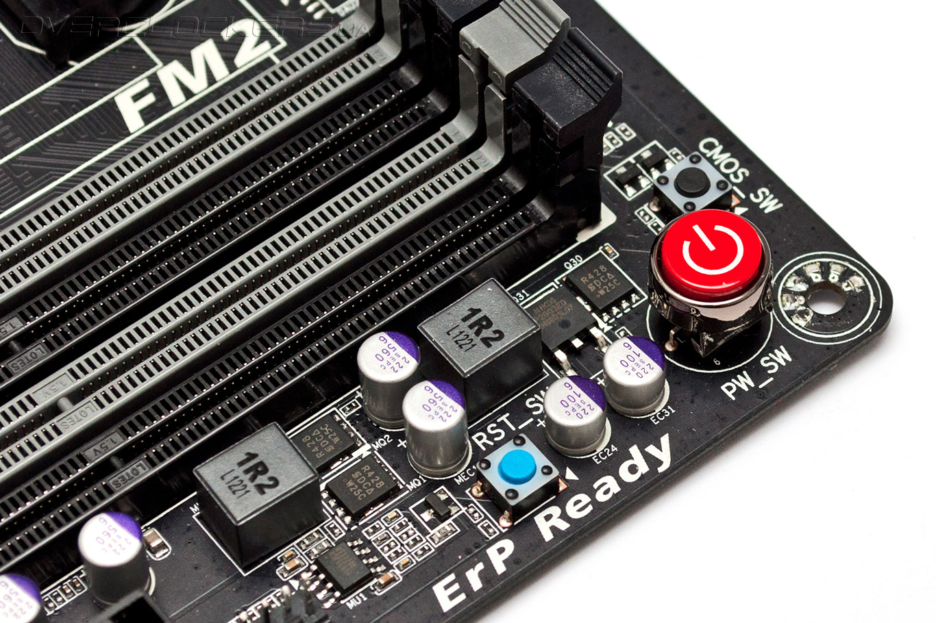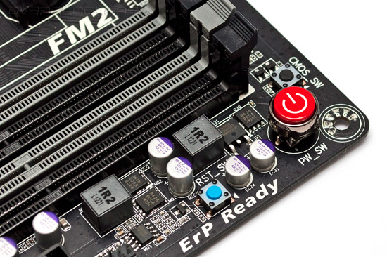 Поскольку производитель позиционирует новинку в качестве решения для требовательных пользователей и энтузиастов, в её конструкции есть ряд особенностей, облегчающих процесс разгона. Например, в правом нижнем углу печатной платы можно встретить аппаратные кнопки включения питания, перегрузки и сброса настроек прошивки. Их наличие непременно оценят пользователи открытых стендов.