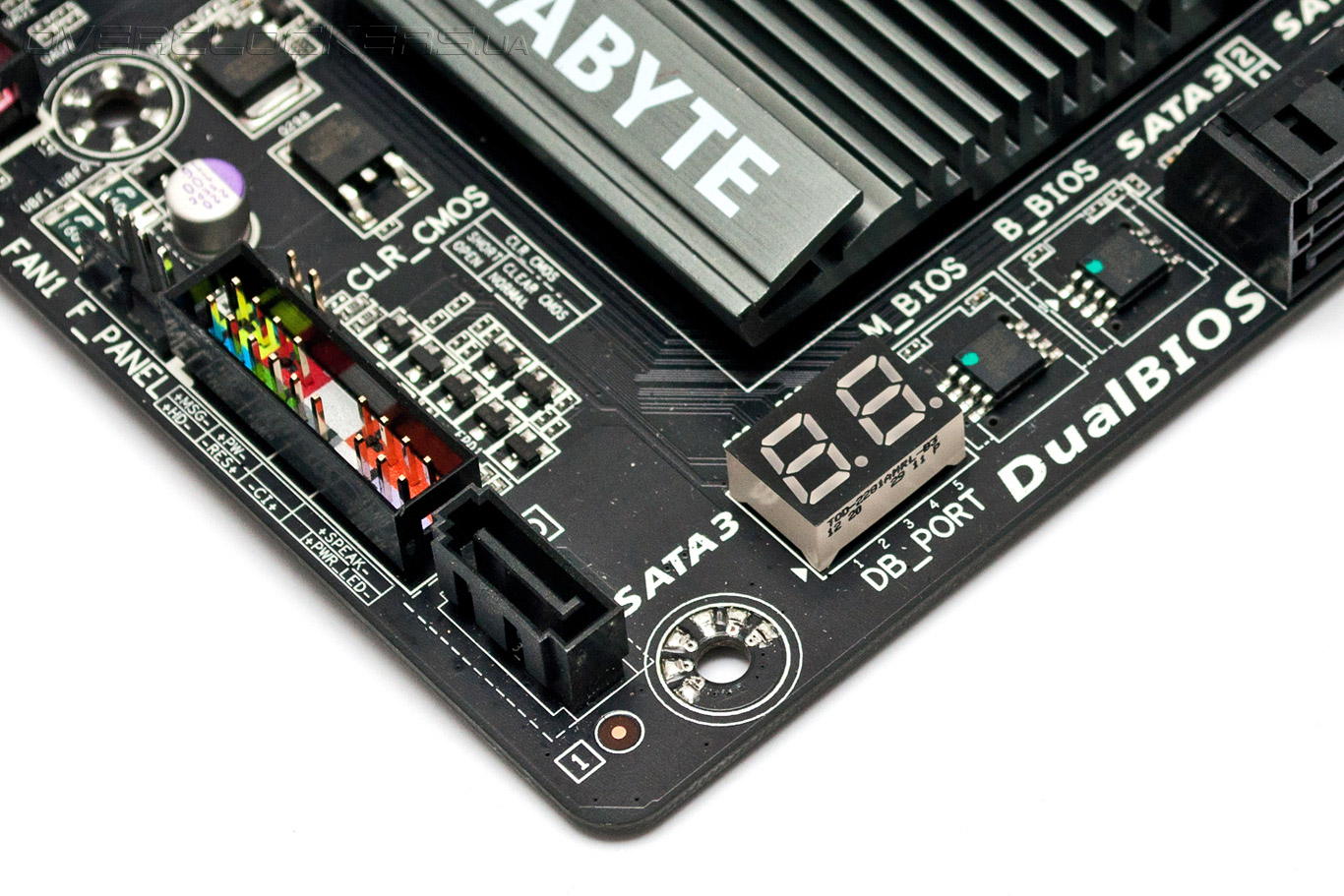 С левой стороны расположился светодиодный индикатор POST-кодов, отображающий процесс загрузки материнской платы. Здесь же находятся основная и резервная микросхемы EPROM, в которых записаны управляющие микрокоды. В случае, если во время обновления прошивки произойдет сбой, технология DualBIOS автоматически начнет загрузку UEFI из резервной микросхемы.