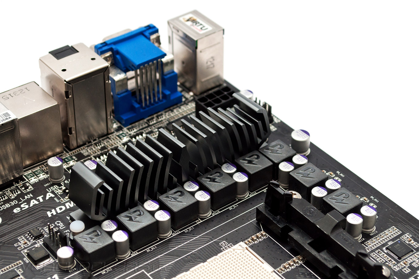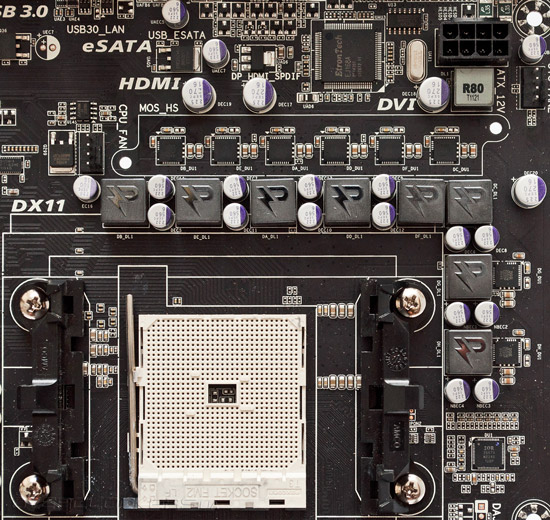 Дополнительное питание подается посредством восьмиконтактного разъема EPS12V, а избыточное тепло от шести из восьми силовых элементов VRM отводится пассивным радиатором. Одним словом, запаса прочности преобразователя напряжения должно хватить для успешного разгона AMD A-Series второго поколения.