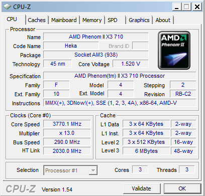 С разблокированием Phenom II X3 710 до полноценного четырехъядерника не возникло никаких проблем. Полученный в результате снимок окна CPU-Z ничем не отличается от приведенных ранее. Самый простой способ выполнить разблокирование — воспользоваться возможностями BIOS платы. Достаточно при старте системы нажать на клавиатуре латинскую литеру «Х». После чего плата сама произведет все необходимые манипуляции.