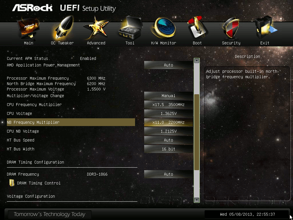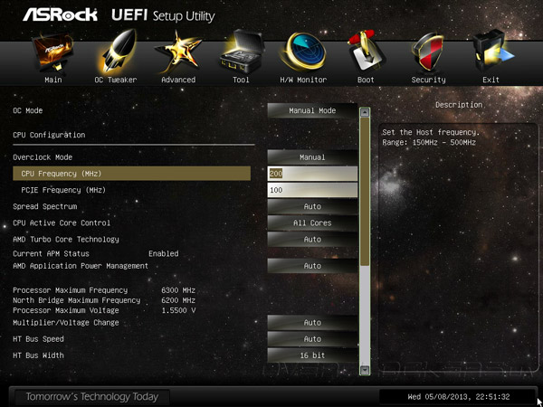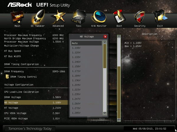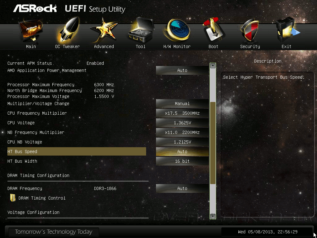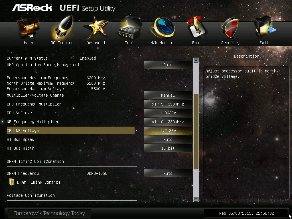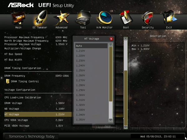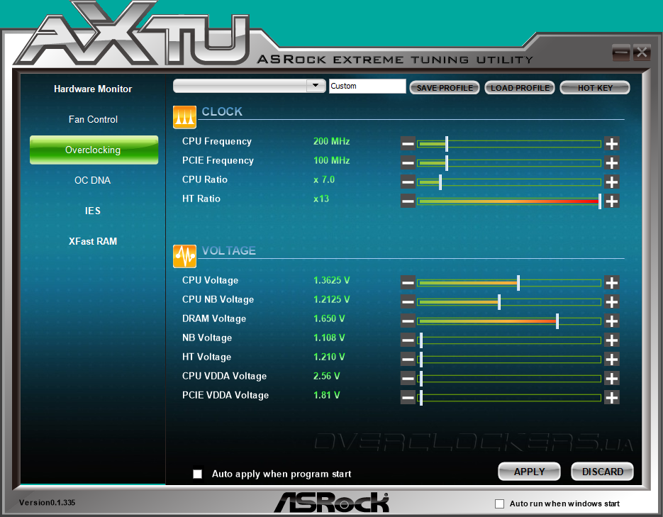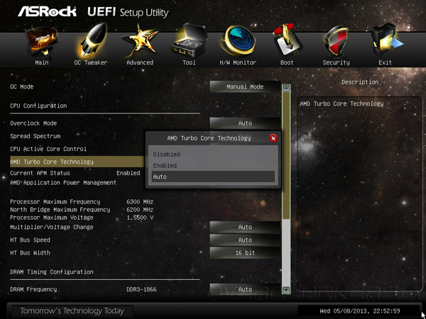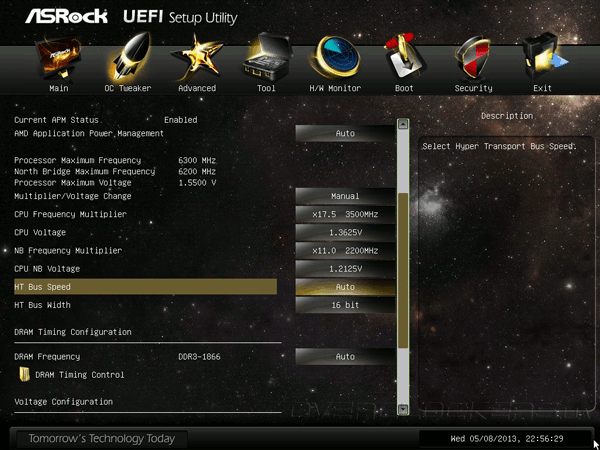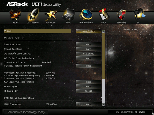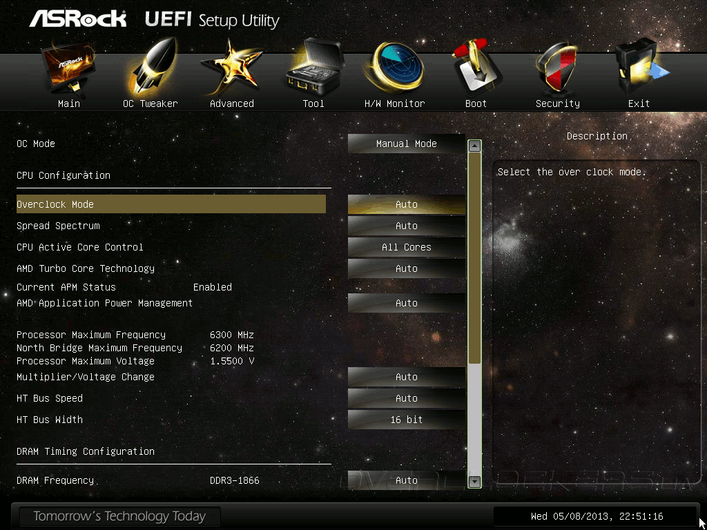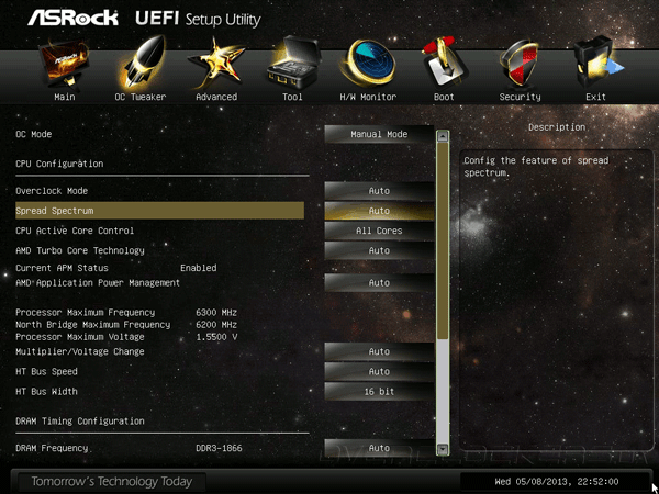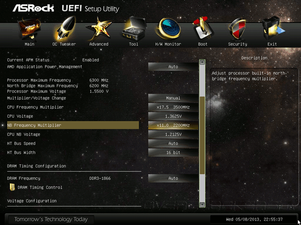 Привычно, что следом за пунктом Main находится OC Tweaker. Напоминаем, что стартовую страницу можно изменить в первой вкладке. Самый первый пункт позволяет воспользоваться некими профилями и в один клик разогнать систему, даже на 35%! По нашим сведениям не каждый процессор FX-серии способен на такое. Примечательно, что каждый из профилей обладает уникальным рецептом для достижения цели: повышаются не только множитель ЦП, но и напряжения, частота тактового генератора (или CPU Frequency в интерпретации ASRock) и даже частоты встроенного северного моста (NB) и шины HyperTransport!