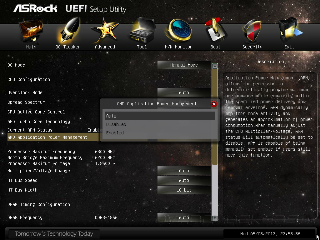 При активации этот параметр открывает еще один сомножитель при ручной конфигурации работы ЦП, функционирующего в Turbo-режиме. Сама же технология, в привычном её понимании, управляется при помощи поля Application Power Management (для удобства сократим её к APM).