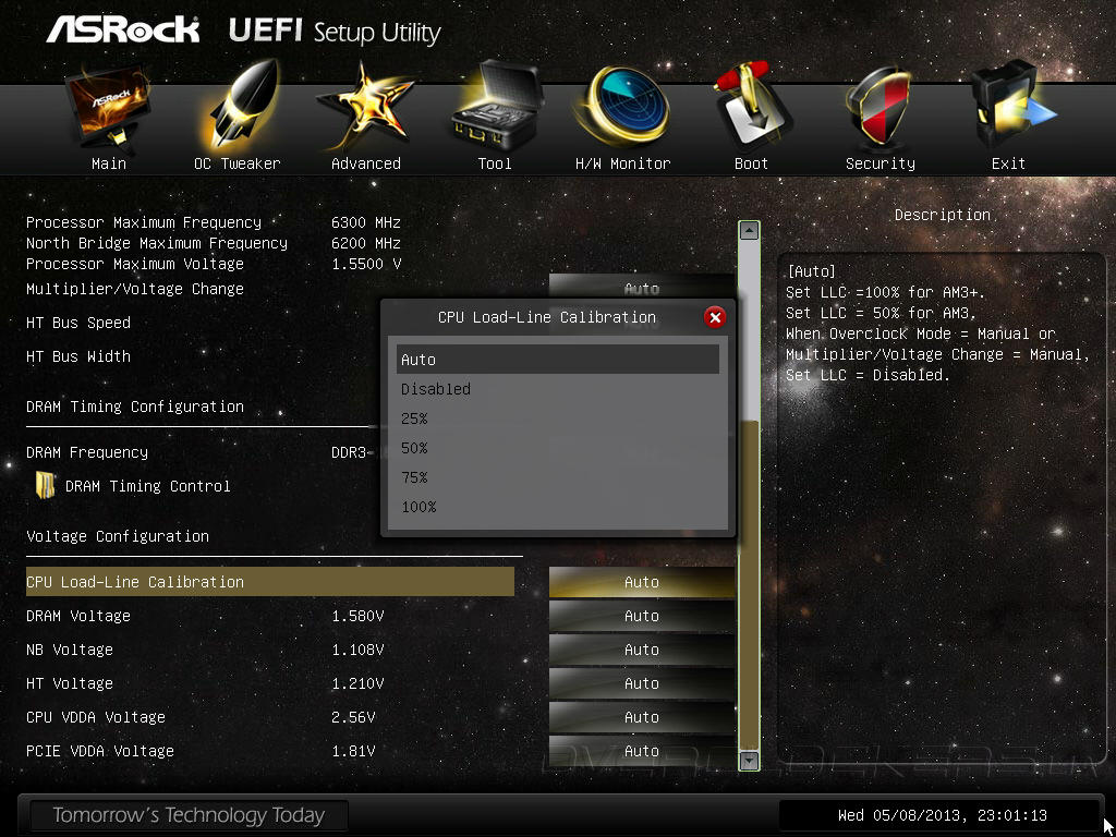 Теперь очередь модуля управления напряжениями и их стабилизации. Предел увеличения напряжения на памяти, прямо сказать, невелик, но всё же весьма серьезен. Стабилизация напряжения на ЦП (Load Line Calibration) реализована единым пунктом с небольшим выбором преднастроек. Однако в процессе тестирования оказалось, что таковых вполне достаточно.
