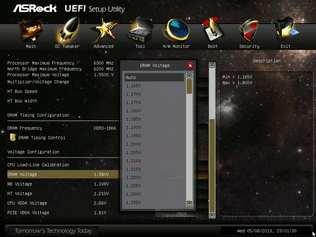 | DRAM Voltage (В) | 1,165–1,8 | 0,005 |