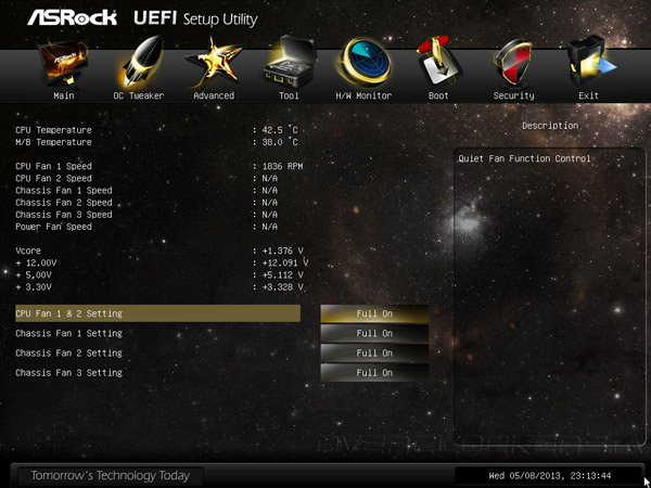 На очереди вкладка H/W Monitoring, где можно управлять работой системных вентиляторов. Предусмотрено подключение шести штук, мониторинг за оборотами также поддерживается для каждого из них. Управлять можно тремя, подключенными к разъемам с надписью CHA, а также группой из двух процессорных. Единственным, не имеющим управления, оказался Power Fan.