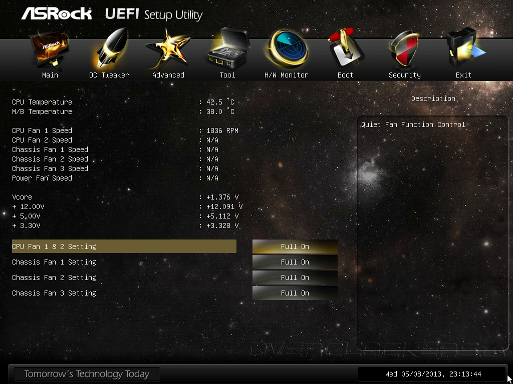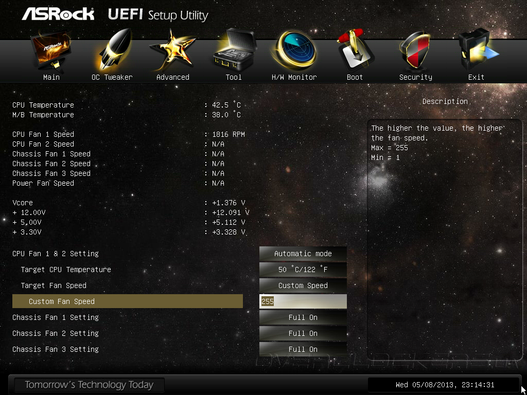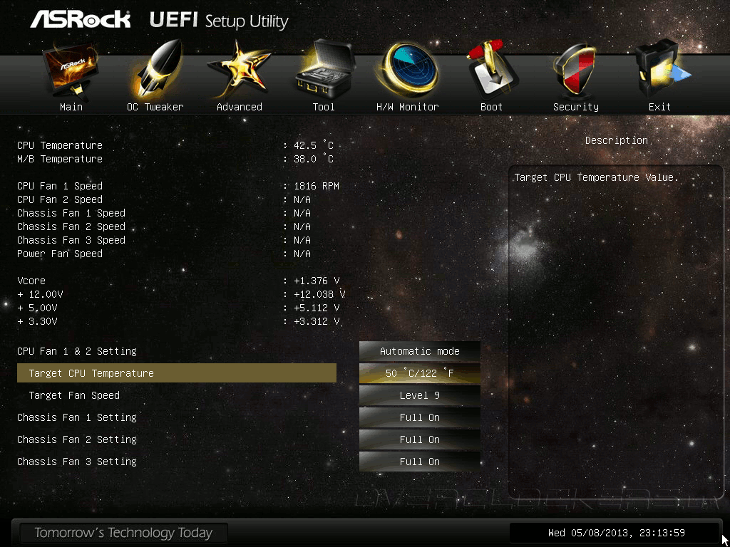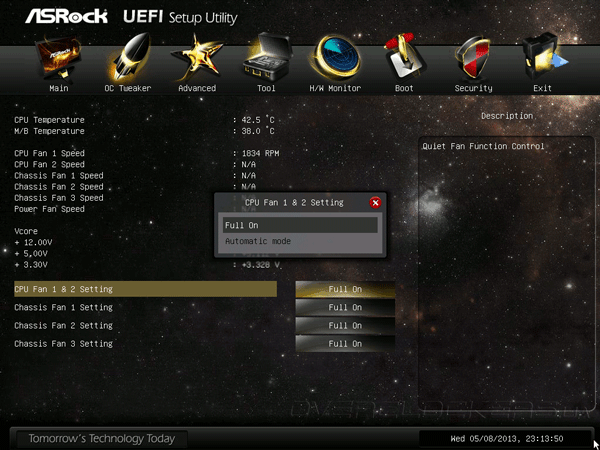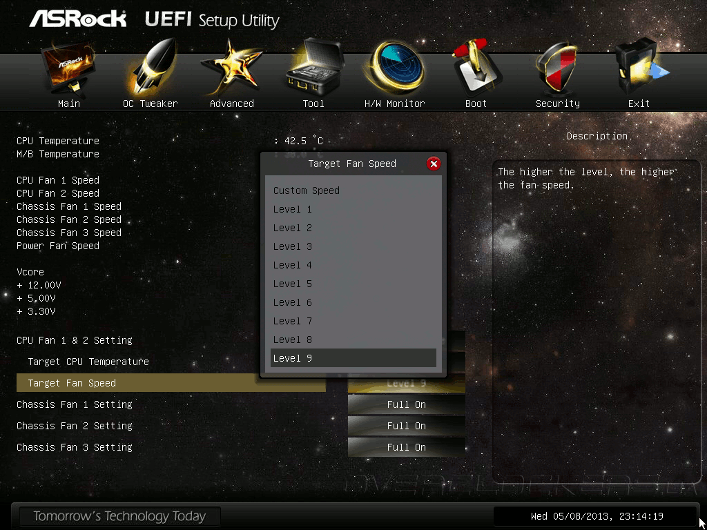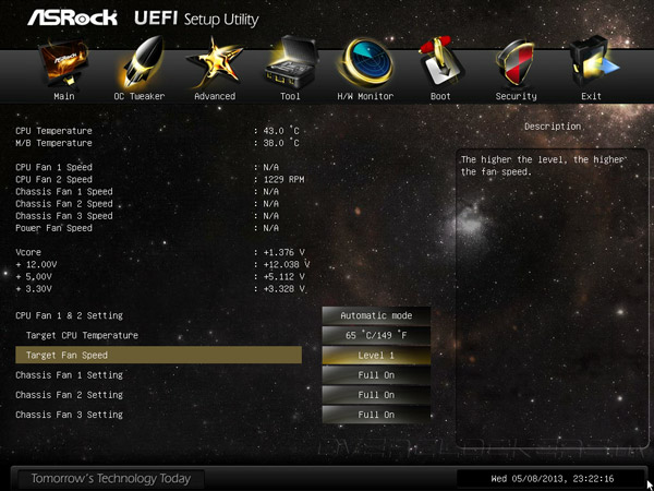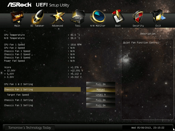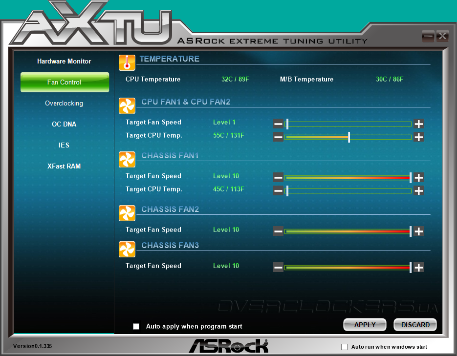 Управление скоростью вращения может осуществляться либо в автоматическом режиме, либо в ручном. В случае авто-режима необходимо задать температуру процессора, при котором вентилятор будет работать на 100% оборотах. В случае ручного режима привязка к температуре отсутствует, а вентилятор выходит на 100% обороты по желанию материнской платы. Авто-режим доступен лишь для моделей, имеющих 4-контактный разъем. Управлять скважностью ШИМ можно лишь у главного — процессорного вентилятора. Для всех прочих придётся довольствоваться выбором одного из девяти готовых профилей работы. У процессорной группы активен лишь авто-режим.