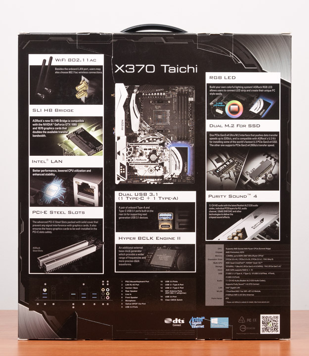 Особенности продукта изложены на задней части упаковки. Выделяется присутствие комплектного адаптера беспроводных сетей и внешнего генератора опорной частоты. Тут можно изучить фото платы и набора выходов, расположенных на задней панели, ещё есть таблица с основными характеристиками.