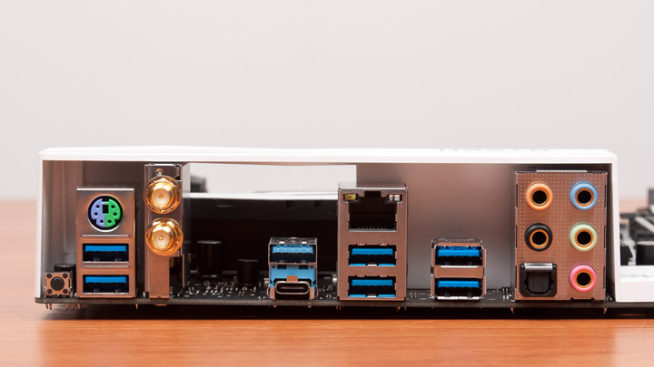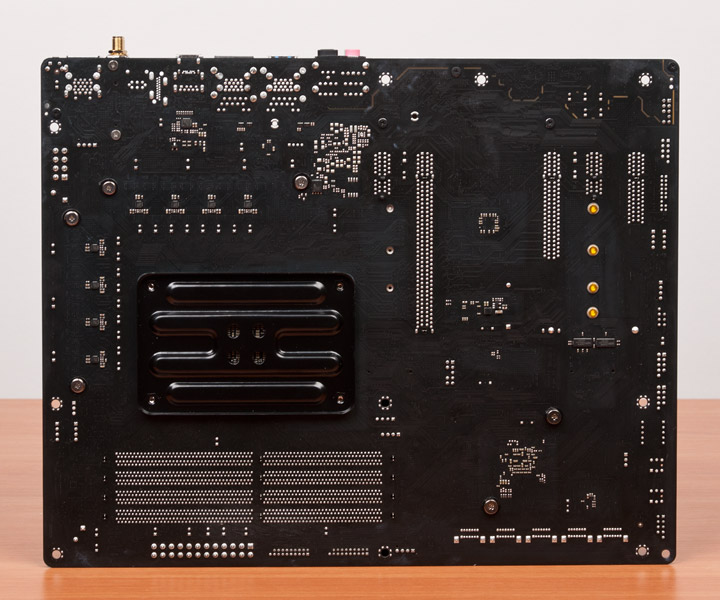 Набор гнёзд задней панели сокращён при сравнении с младшей моделью, а всё из-за отсутствия видеовыходов. Беспроводной адаптер предустановлен. Появилась кнопка, позволяющая провести сброс настроек CMOS. В целом, имеющийся комплект неплох, однако от старших продуктов ожидаешь обычно чего-то большего.