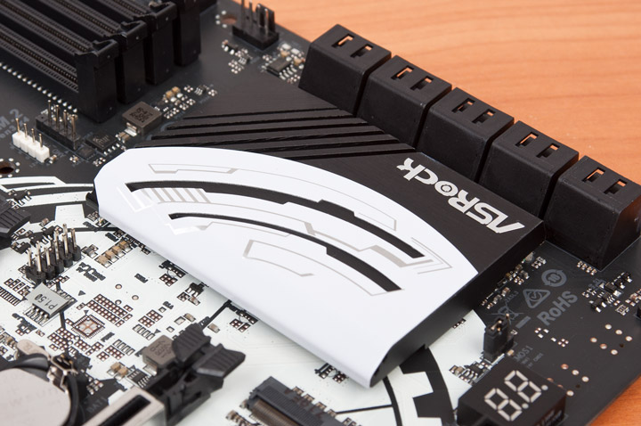 Собственная подсветка у X370 Taichi представляет немногочисленный набор светодиодов типа RGB, все они распаяны под охладителем для хаба. Это довольно солидный, практически монолитный брусок металла, также имеются декоративные элементы. С обязанностями он справился без замечаний.