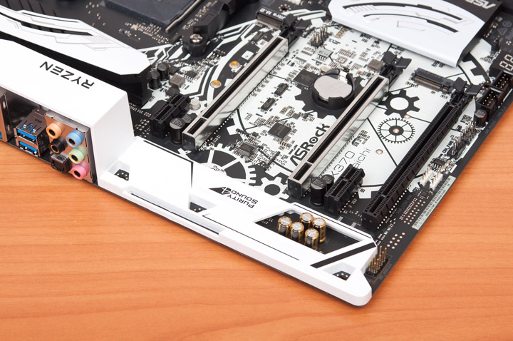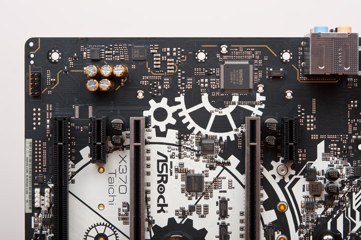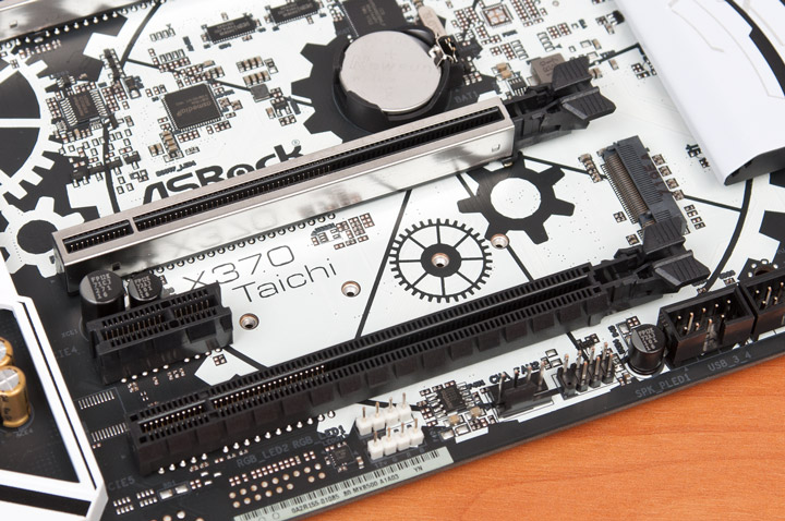 Пара блестящих слотов PCI-E способна поделить поровну 16 линий от ЦП, остальные работают от AMD X370.