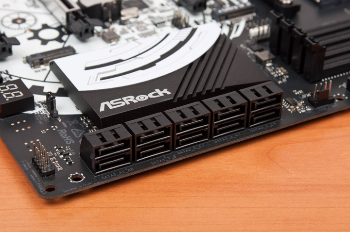 Десять выходов SATA набраны продольными гнёздами. Пара, работающая от стороннего контроллера, имеет отличительное обозначение на поверхности изделия.