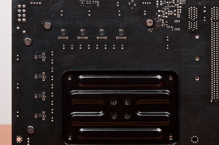 Силовой блок оснащён немалым числом сопроводительных компонентов на обратной стороне платы, потому в режиме открытого стенда потребуется осторожность при обращении с устройством. Для крепежа козырька и радиаторов используются винты.