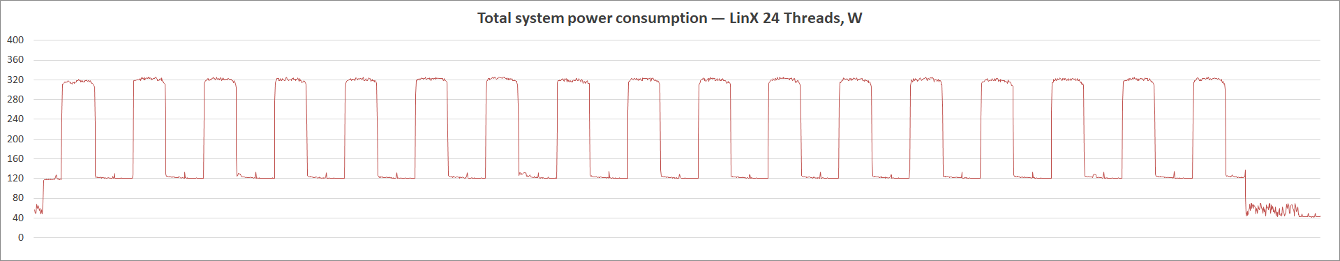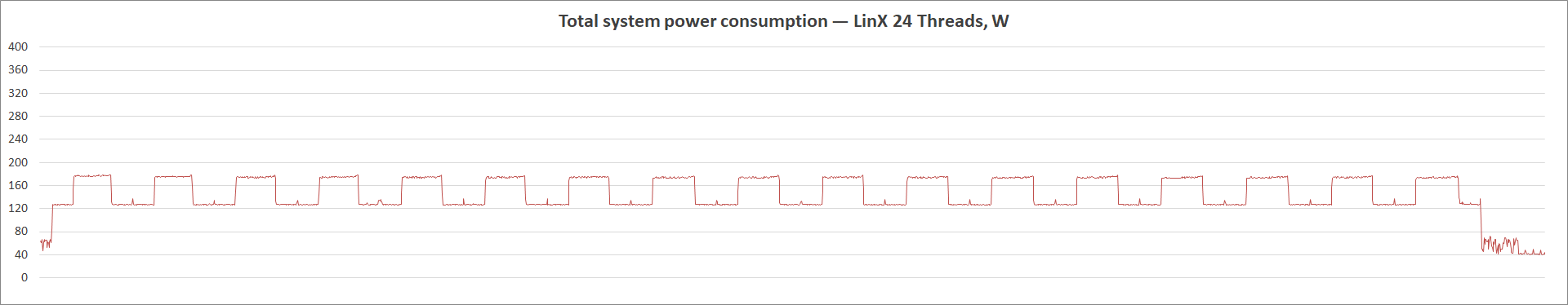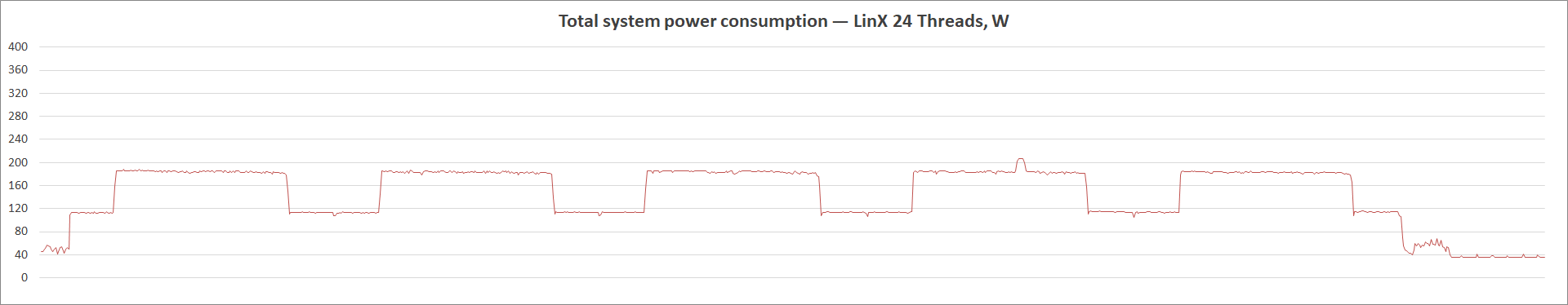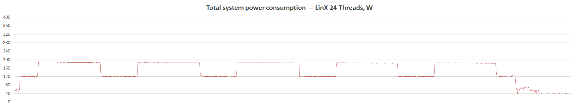 Граничные уровни потребления энергии — 37–189 Вт. Произошёл ожидаемый рост производительности подсистемы памяти и, как следствие, видно ускорение в LinX.