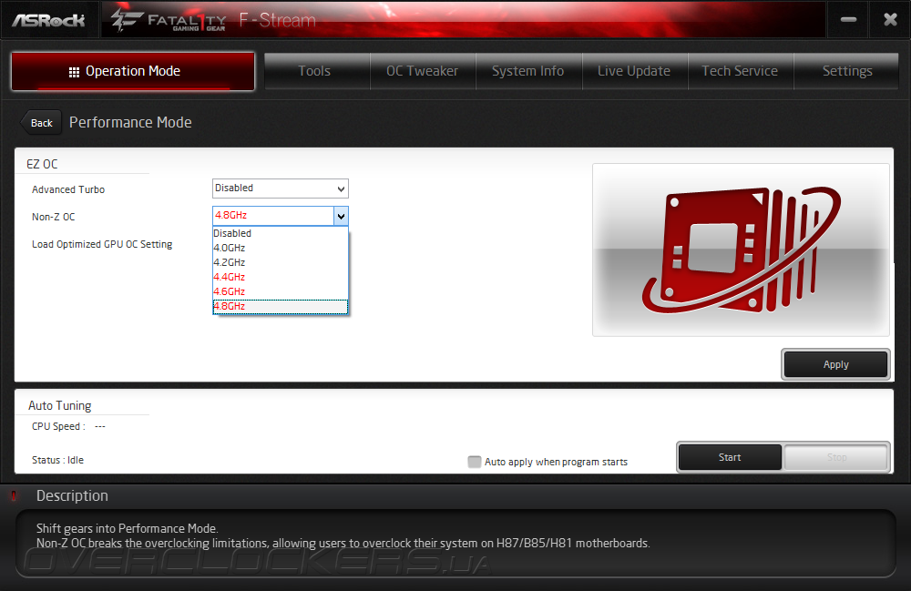 Центральная роль уготована кнопке Operation Mode. В разделе Performance содержимое точь-в-точь такое же, как и у продуктов на базе Z87, а значит возможность производить разгон в один клик из-под ОС тоже доступна.