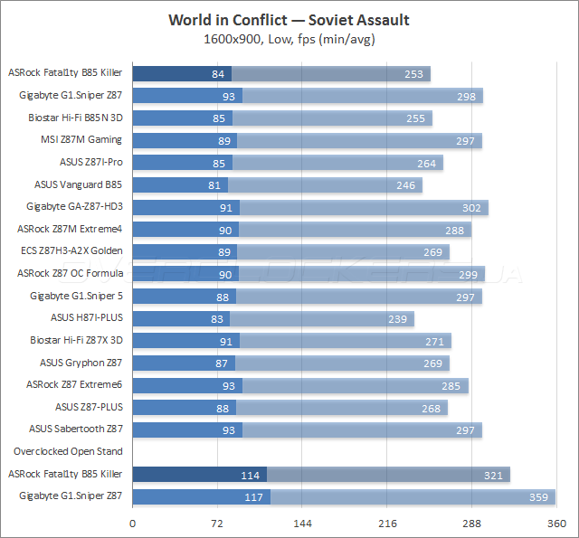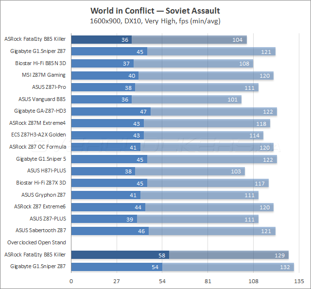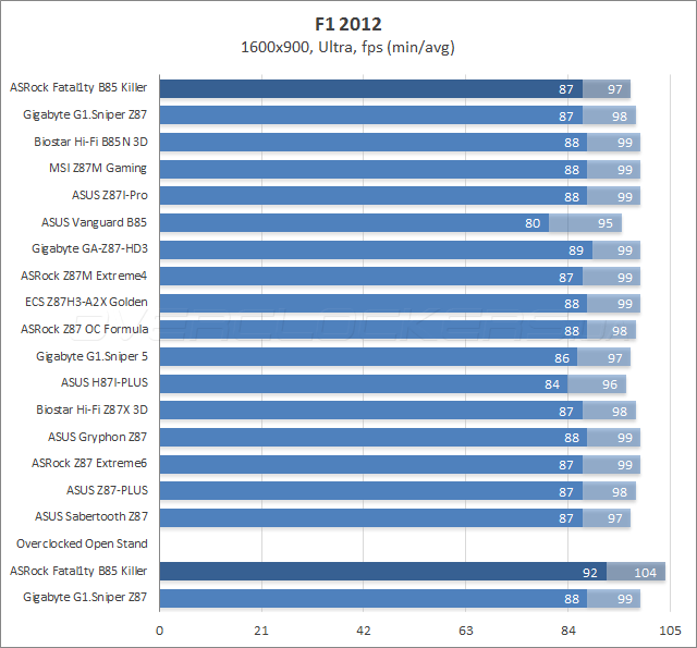 Всего один из шести игровых тестов демонстрирует в лице системы на основе Z87 явного лидера, когда преимущество достигает уровня около 11%. Результаты разогнанного стенда на основе Fatal1ty B85 Killer в F1 2012 и вовсе преподнесли небольшой сюрприз: оказывается, агрессивные настройки DRAM для неё предпочтительнее ускоренного процессора.