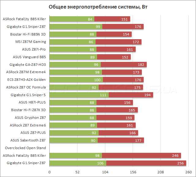 При этом потребление энергии снижается до ещё более низкого уровня — 83–144 Вт, а это вплотную приближает плату к показаниям скромной ASUS H87I-Plus.
