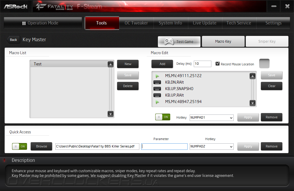 Как я и обещал, остановимся лишь на самом интересном. Key Master это небольшое дополнение, где можно записывать макросы и назначать для них «горячие кнопки». Функциональность не то чтобы богатая, но всё выполнено вполне наглядно, а главное — работоспособно, что немаловажно для тех, кто с подобными утилитами работает впервые.