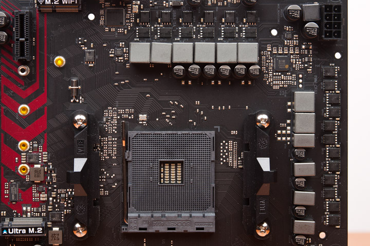 Немаловажным является факт присутствия индикатора кодов POST. Пустующее место в центре устройства, по всей видимости, предназначалось под внешний генератор опорной частоты, но в последний момент от него решили отказаться, сделав этот элемент особенностью только самых старших моделей. Ещё одна отличительная черта — наличие посадочного места под платы расширения M.2 формата 2230 (Key E), иначе говоря, предназначенного под современные адаптеры беспроводных сетей с интерфейсом PCI-E. Основные возможности перечислены в таблице: