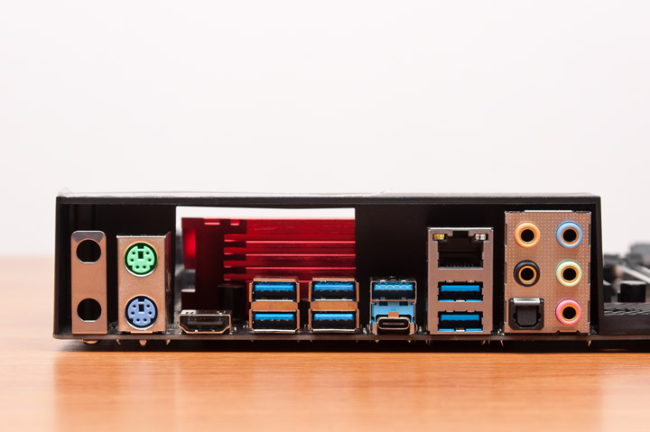 Конфигурация задней панели весьма необычна. В целом, жаловаться на восемь выходов USB нельзя, но здесь все они находятся очень близко друг к другу, с подключением кабелей проблем не будет, а вот какое-либо устройство сюда уже может не вместиться. Было бы неплохо видеть здесь хотя бы (одну) кнопку — для сброса настроек, но её нет, зато распаяны два гнезда PS/2.