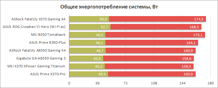 Замеры выполнялись после прохождения всех прочих тестов в «устоявшемся» режиме компьютера при помощи прибора собственной разработки. Для создания нагрузки использовался профиль In-place large FFTs в составе утилиты Prime95 (28.10). Производился расчёт среднего значения потребления тестового стенда «от розетки» на протяжении восьми минут работы программы, а затем, после завершения теста, ещё минуту замерялся уровень, соответствующий состоянию простоя системы.