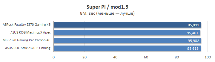 Здесь есть всё необходимое для оверклокинга разного рода. Но в каждом случае имеются свои оговорки. При разгоне опорной частоты у меня получились самые низкие результаты на фоне уже полученных при участии других плат. Разгон процессора позволил увидеть максимум, доступный на «воздухе». Однако с привлечением серьёзных сценариев стресс-тестирования частотный предел пришлось серьёзно занизить, чтобы не было перегрева ЦП, полученный уровень снова был ниже, чем с другими платами, а потребление энергии при этом оказалось самым высоким. Можно было бы говорить о плохом КПД преобразователя питания, но с его температурой при испытаниях явных проблем не было зафиксировано. Наконец, разгон памяти проявил яркий характер Fatal1ty Z370 Gaming K6, но высокая полученная частота напомнила о старых добрых временах, когда в разговорах оверкловеров фигурировал термин «кукурузный разгон».