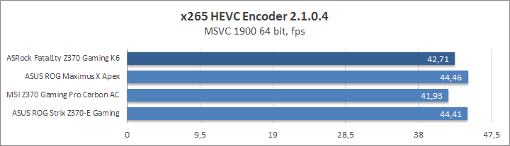 При выполнении тяжёлых задач частота процессора составляла 4,1 ГГц, таким образом, испытуемая встаёт в один ряд с уже рассмотренной MSI Z370 Gaming Pro Carbon AC, а на обеих протестированных платах от ASUS формула равнялась 4,3 ГГц вне зависимости от типа нагрузки.
