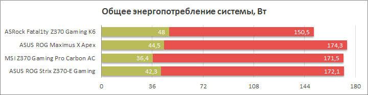Замеры выполнялись после прохождения всех прочих тестов в «устоявшемся» режиме компьютера при помощи прибора собственной разработки. Для создания нагрузки использовался профиль In-place large FFTs в составе утилиты Prime95 (29.3). Производился расчёт среднего значения потребления тестового стенда «от розетки» на протяжении восьми минут работы программы, а затем, после завершения теста, ещё минуту замерялся уровень, соответствующий состоянию простоя системы.