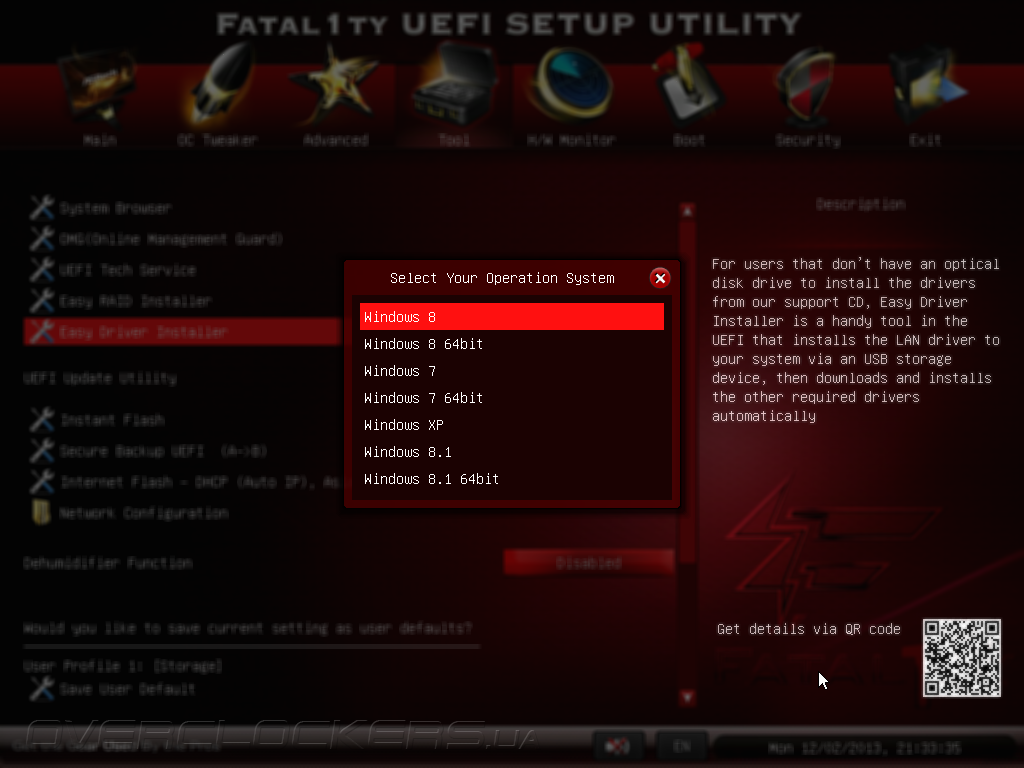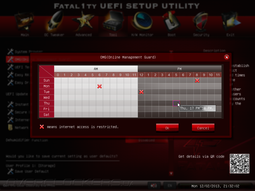 Прошивка ASRock Fatal1ty Z87 Killer имеет подпрограмму для просмотра подробной информации об аппаратном обеспечении System Browser и утилиту OMG (Online Management Guard), позволяющую блокировать сетевое подключение по расписанию.